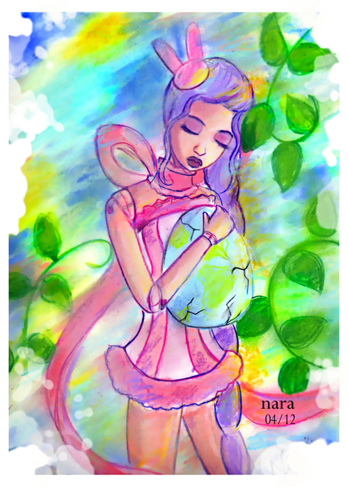 Like a bird who must break it’s shell to be born, you too must break through the barriers that confine you. Influences that went into this one in no particular order: Spring, Utena, Life, Death, Rebirth, The World, Bunnies… Though when I’m actually working, it all goes by in blur. This is was done with soft pastels on paper.