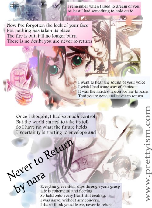 Art, Poetry Never to Return (visual poetry) Date: June 18, 2013Author: prettyism 0 Comments So if you were in a good mood… This is a song from Broken Wings when Gavin has a flashback to the day his parents died. Though it also applies to the general motif of loss that is running through the story, as well. . Share this: Click to share on X (Opens in new window) X Click to share on Facebook (Opens in new window) Facebook Click to email a link to a friend (Opens in new window) Email Click to share on Pinterest (Opens in new window) Pinterest Click to print (Opens in new window) Print Click to share on Tumblr (Opens in new window) Tumblr More Click to share on Reddit (Opens in new window) Reddit Click to share on Pocket (Opens in new window) Pocket Click to share on Telegram (Opens in new window) Telegram Click to share on Threads (Opens in new window) Threads Click to share on Mastodon (Opens in new window) Mastodon Click to share on X (Opens in new window) X Click to share on Bluesky (Opens in new window) Bluesky Like Loading... Related